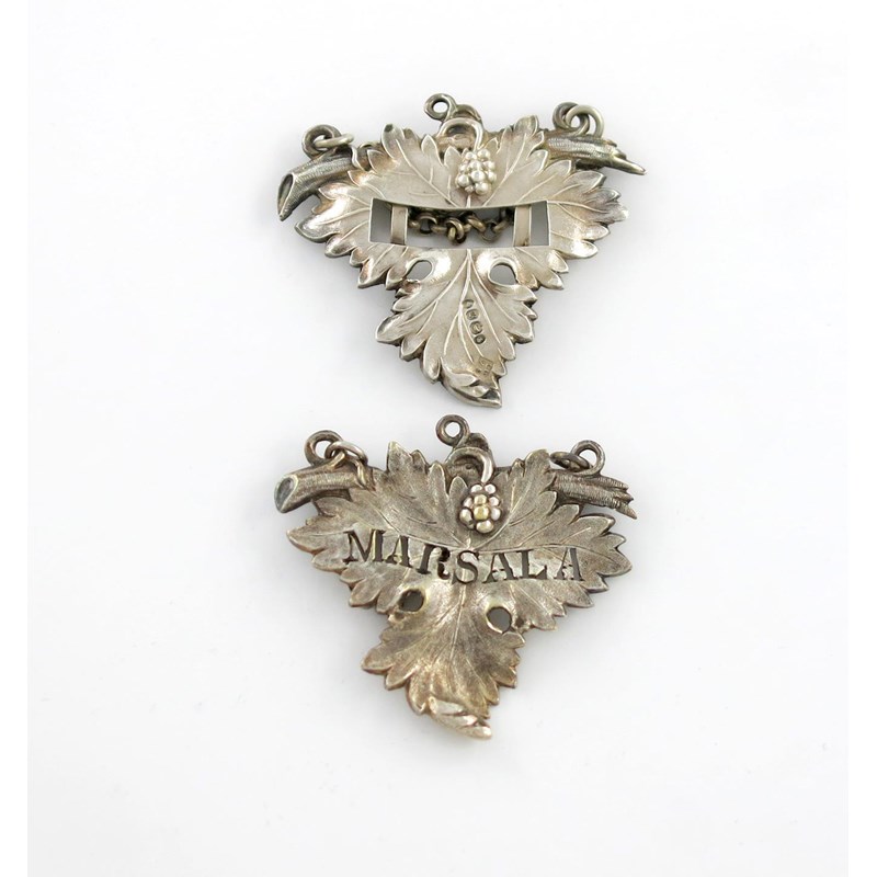 vine leaf form, length 6.8cm, plus an electroplated vine leaf label, pierced 'MARSALA', approx. weighable 0.8oz. (2)