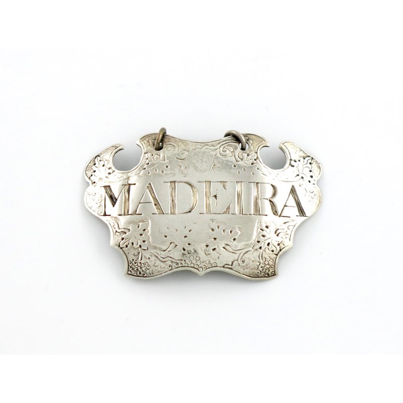 escutcheon form, chased trailing vine decoration, incised 'MADEIRA', length 5cm, approx. weight 0.3oz.