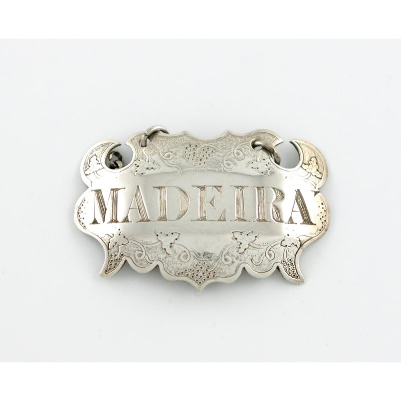 escutcheon form, chased vine decoration, incised 'MADEIRA', length 5.3cm, approx. weight 0.4oz.