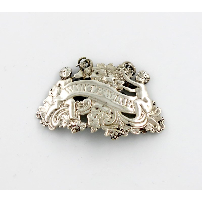 shaped form, with Bacchanalian cherubs with a jug and bottle and trailing grapevines, incised 'WHITE WINE' length 6cm, approx. weight 0.4oz.