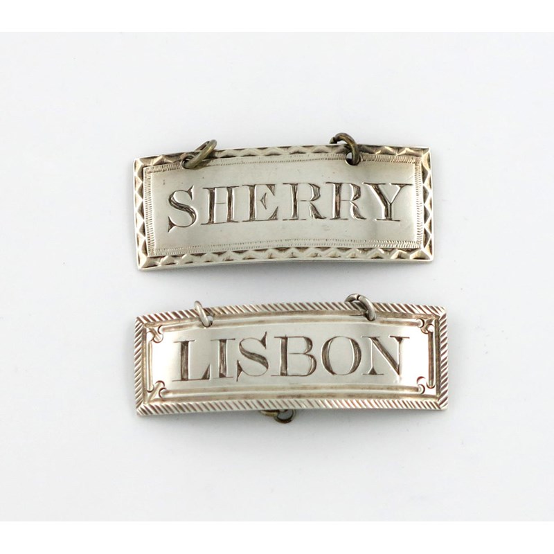 one by Susannah Barker, London circa 1784, the other London 1821, rectangular form, rope-work and bright-cut borders, incised 'LISBON' and 'SHERRY', approx. weight 0.4oz. (2)