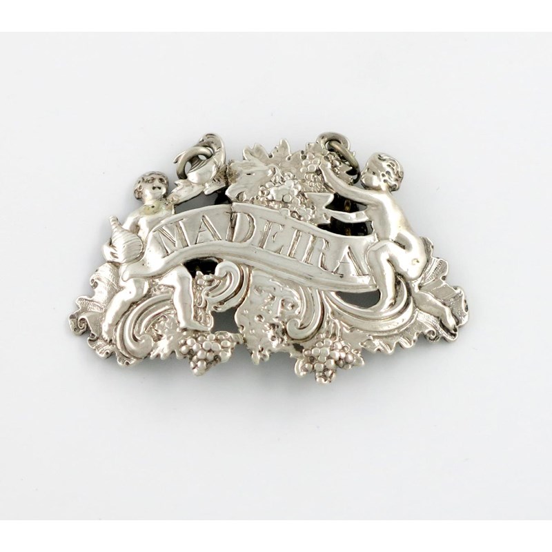 shaped form, with Bacchanalian cherubs with a jug and bottle and trailing grapevines, incised 'MADEIRA', length 6.2cm, approx. weight 0.5oz.