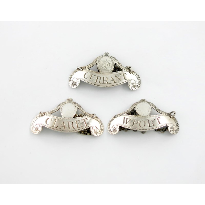 scroll form, with pierced raised pediments, one initialled, bright-cut borders, incised 'CURRANT', 'CLARET' and 'W. PORT', length 5.4cm, approx. weight 1oz. (3)