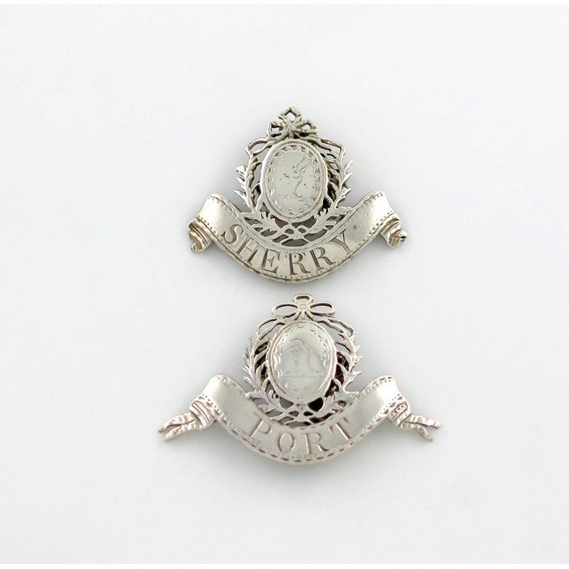 banner form, bright-cut borders, pierced foliate pediment, engraved with two crests, length 6cm and 4.8cm, approx. weight 0.8oz. (2)