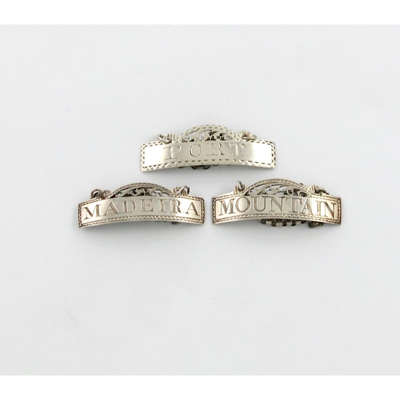 narrow arched rectangular form, pierced decoration, bright-cut borders, incised 'MOUNTAIN', 'MADEIRA', and 'PORT', length 4.4cm, approx. weight 1.2oz. (3)