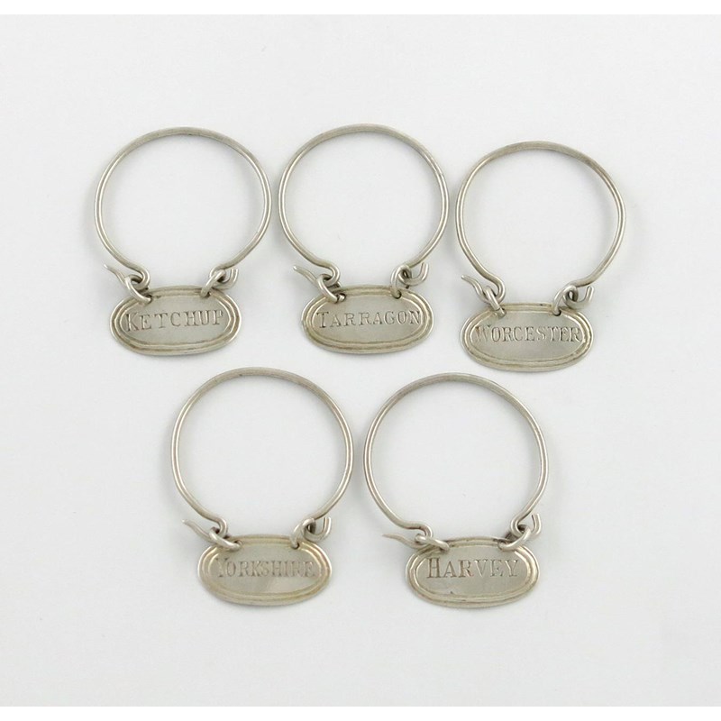 oval form, reeded borders, incised 'YORKSHIRE', 'WORCESTER', 'TARRAGON', 'HARVEY', and 'KETCHUP', length 2.5cm, approx. weight 0.6oz. (5)