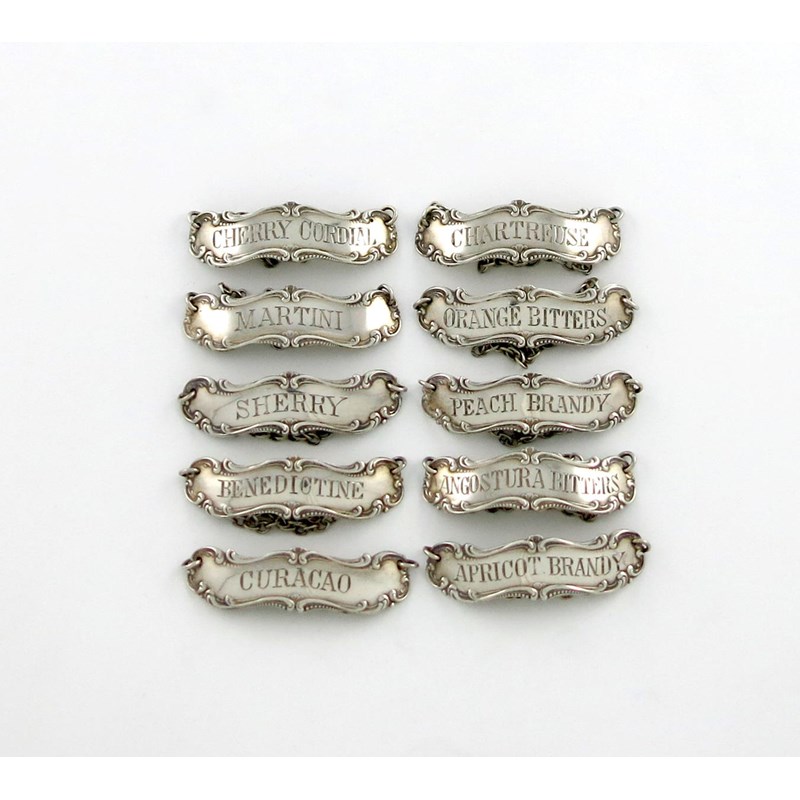 banner form, scroll and bead border, incised 'CHERRY CORDIAL',' PEACH BRANDY', 'ORANGE BITTERS', 'ANGUSTURA BITTERS', 'MARTINI', 'CHARTREUSE', 'BENEDICTINE', 'CURACAO', 'SHERRY' and 'APRICOT BRANDY', length 4.8cm. (10)