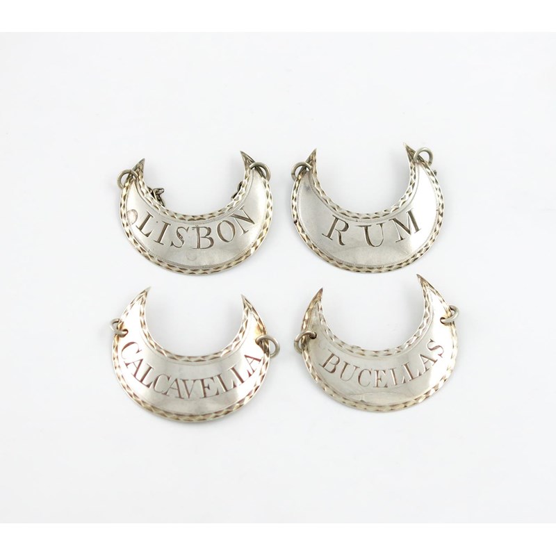 crescent form, bright-cut border, incised 'CALCAVELLA', 'RUM', 'BUCELLAS' and 'LISBON', approx. weight 0.7oz. (4)