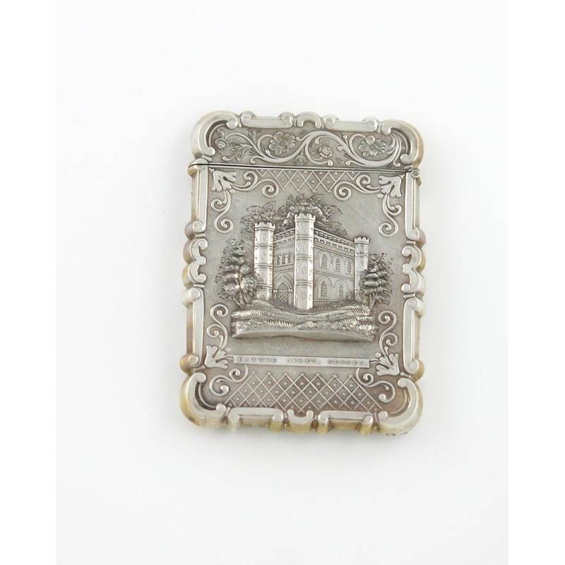 rectangular form, scroll borders, the front with an embossed scene of the gatehouse, foliate scroll decoration, the reverse with similar decoration, length 9cm, approx. weight 1.5oz.