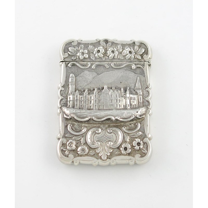 rectangular form, scroll borders, the front with a raised scene of the House, on a matted background, within foliate scroll decoration, the reverse with similar decoration and with an inscribed cartouche, 'F.Wright, 1893', length 10cm, approx. weight 2.6oz.