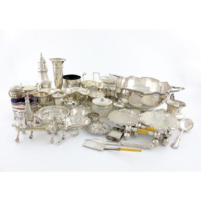 comprising silver items: a pair of sauce boats, Sheffield 1937, a sugar caster, a vase, a pot with cherub decoration, by William Comyns, London 1899, a toast rack, a tea strainer and matched stand, a mustard pot, a pepper pot, two egg cups, (one a.f), three dishes and other items, plus a small quantity of electroplated items including a two-handled bowl, two butter dishes and two jugs, approx. weighable 28oz. (qty)