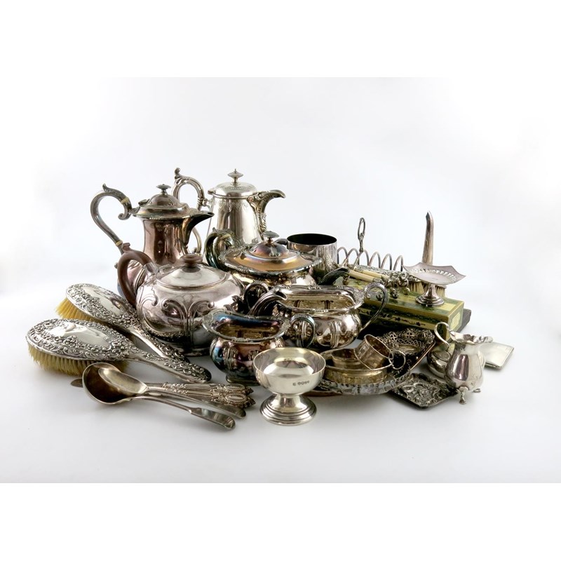 comprising silver items: a travelling chalice, Sheffield 1934, a circular dish, a Chinese ashtray, a cigarette case, a cream jug, four brushes, two dishes, a spoon, two napkin rings, a tobacco box, and six silver-handled cake knives, plus electroplated items, a four-piece tea set, a teapot, a hot water pot, a toast rack, a wine funnel and other items, approx. weighable 19.5oz. (qty)