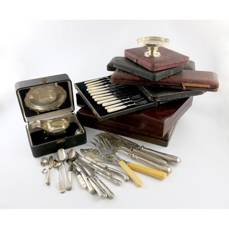 comprising silver items: a cased sauce boat, stand and ladle, by Viner's Ltd, Sheffield 1939, a pair of fish servers, by Mappin and Webb, Sheffield 1910, a dish, plus various spoons and electroplated items including a cased set of twelve fruit knives and forks, two fish serving forks and serving fish knife, approx. weighable 17oz. (qty)