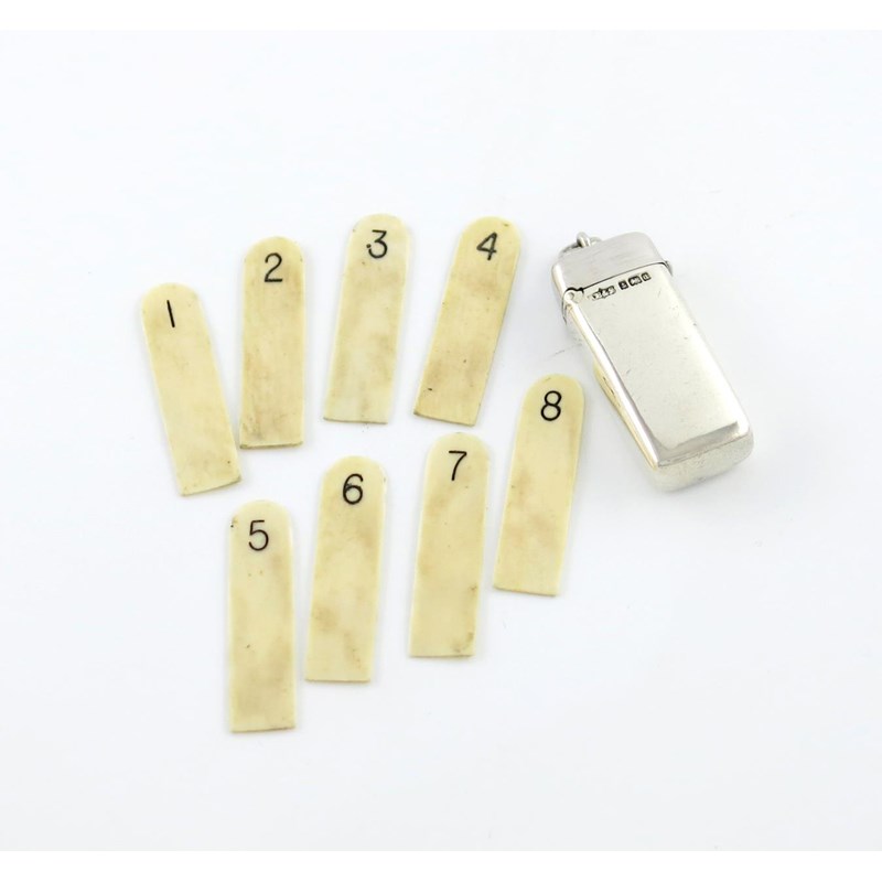 rounded rectangular form, the hinged cover with a ring attachment, the interior with eight ivorine numbered pegs, length 5cm, approx. weight 0.6oz.