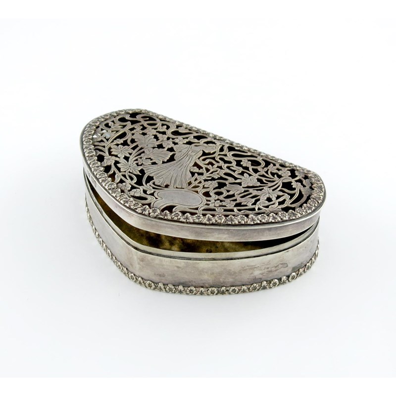 shaped form, the hinged cover pierced and engraved with a female figure and foliate scroll decoration, gilded interior, length 13.4cm, approx weight 6oz.