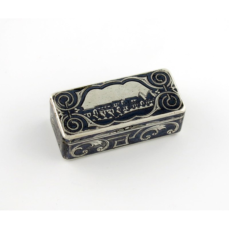 rectangular form, the hinged cover with a townscape scene within scroll borders, the sides and base with similar scroll decoration, length 7.3cm, approx. weight 2.5oz.