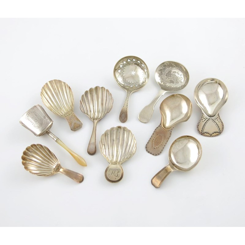 various designs, comprising: one London 1796, the circular bowl with pierced and engraved decoration, one of shovel form, with a mother-of-pearl handle, one by Josiah Snatt, London 1803, and various others, approx. total weight 2.5oz. (10)