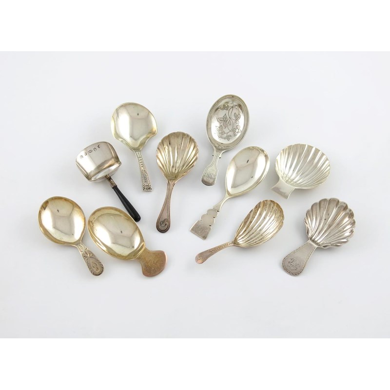 various designs, comprising: one London 1784, fluted bowl, Bright-cut handle, one of shovel form, by Joseph Willmore, Birmingham 1811, one Old English thread pattern, London 1791, and various others, approx. total weight 3.1oz. (10)