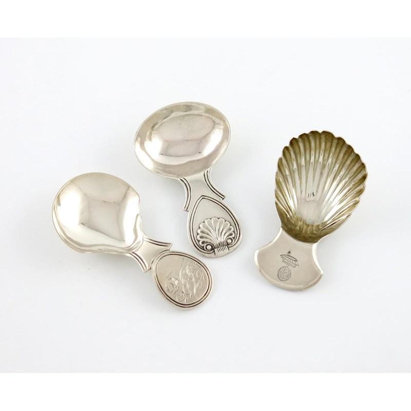 fluted bowl, the terminal with a crest, plus a George IV silver caddy spoon, by Joseph Willmore, Birmingham 1822, with a Thread and Shell terminal, and another caddy spoon by the same maker, Birmingham 1823, Thread edges, the terminal with a monogram, approx. weight 2.1oz. (3)