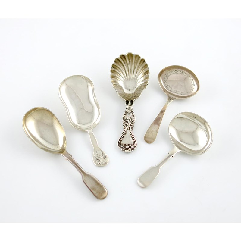 comprising: one with a leaf finial, 1848, a variant King's shape, by James and Josiah Williams, of Bristol, 1859, plus one by George Ferris and two others, approx. total weight 2.5oz. (5)