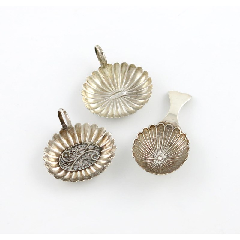 oval fluted bowl, the centre set with a filigree panel, ring handle, plus another caddy spoon of similar shape, marks worn, and another caddy spoon, by William Pugh, Birmingham 1806, oval bowl, fish-tail handle, approx. total weight 0.7oz. (3)