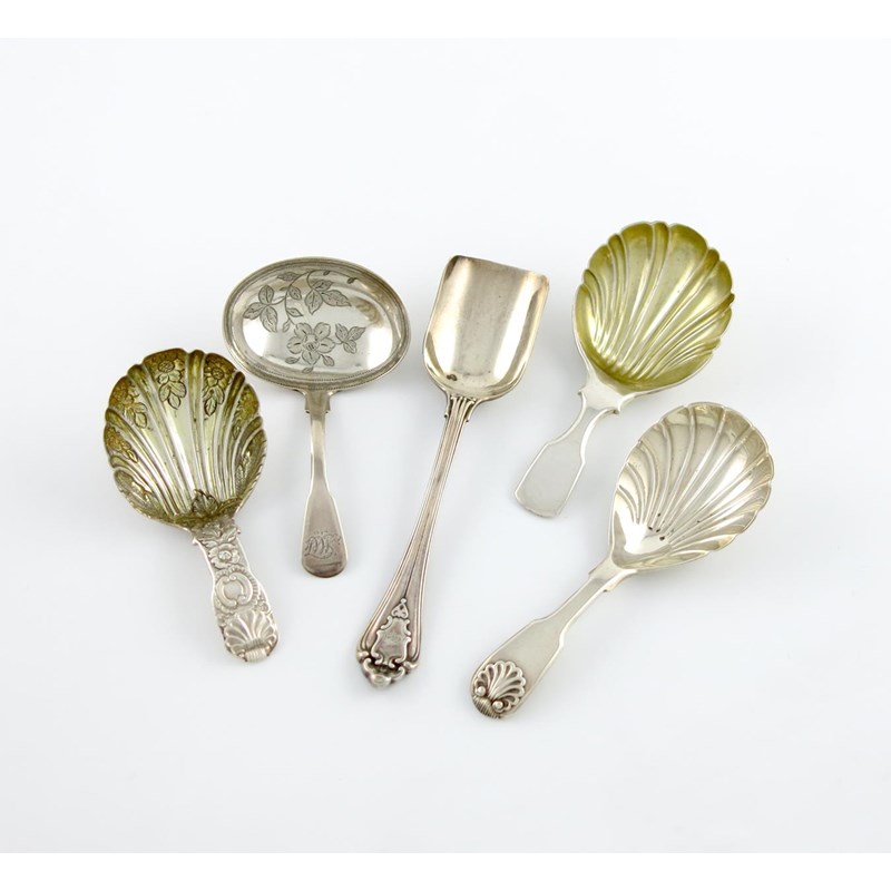 A collection of five antique silver caddy spoons