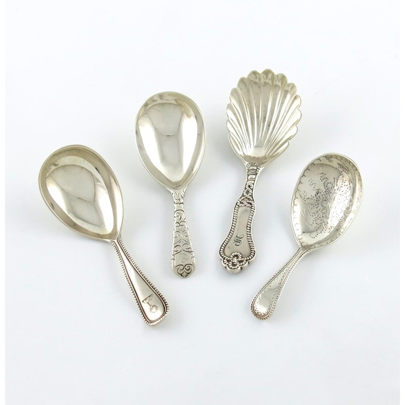 the terminal with an initial, plus three other George Adams caddy spoons, including two Beaded pattern, approx. weight 2.4oz. (4)