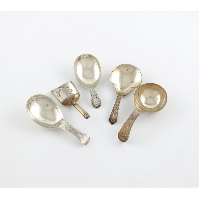 various designs, comprising: one Peter and Ann Bateman, London 1791, the handle Bright-cut, plus one with a pierced shovel bowl, one with an engraved fish-tail handle, Birmingham 1807 and two others, approx. total weight 1.2oz. (5)
