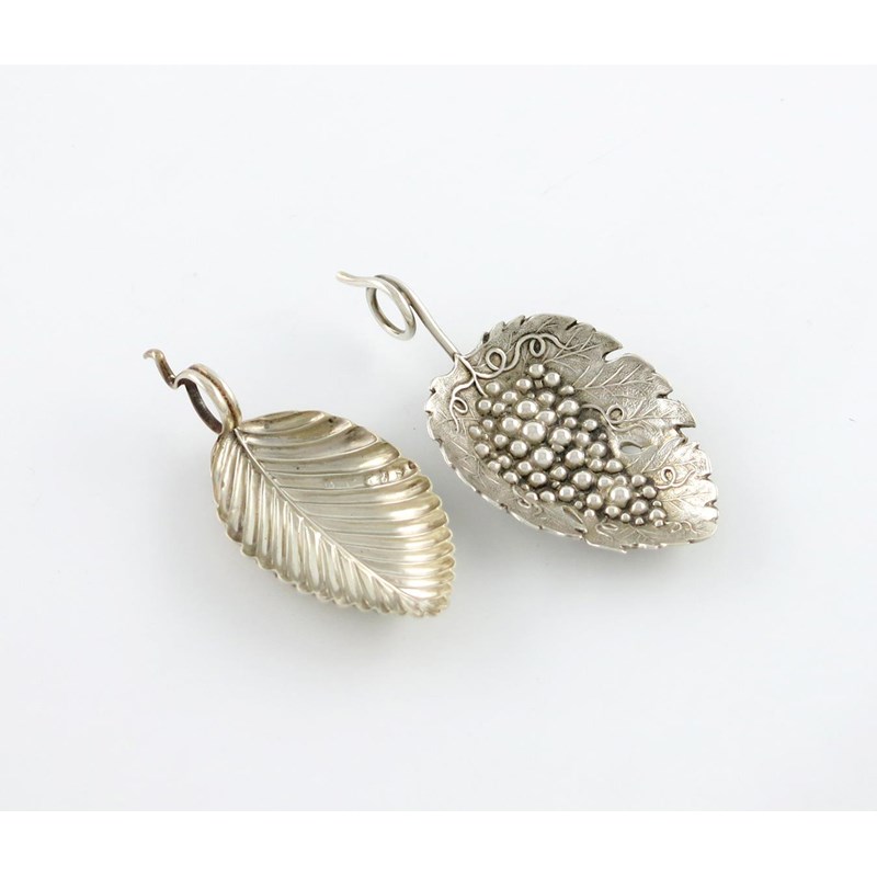 leaf form, the centre embossed with a bunch of grapes, tendril ring handle, length 6.8cm, plus another leaf caddy spoon, by Yapp and Woodward, approx. total weight 0.5oz. (2)