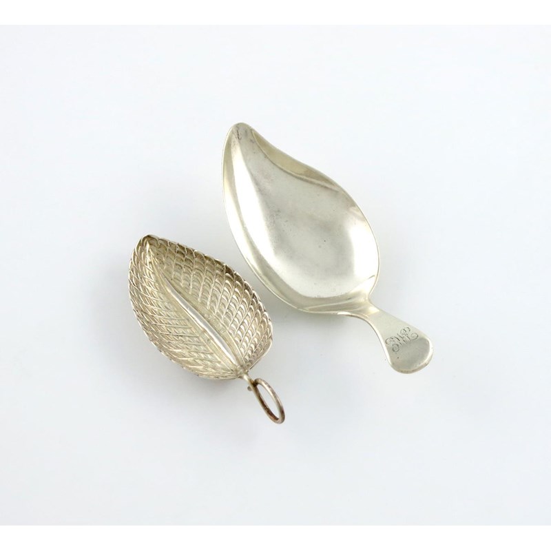 leaf form, textured decoration, wire-work ring handle, plus a George III silver caddy spoon, with a plain leaf shaped bowl, London 1805, approx. total weight 0.8oz. (2)