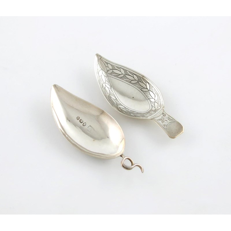 leaf shaped bowl, engraved foliate border, tapering handle, length 8cm, plus a George III caddy spoon, by Elizabeth Morley, London 1795, plain leaf shaped bowl, wire-work handle, approx. weight 0.6oz. (2)