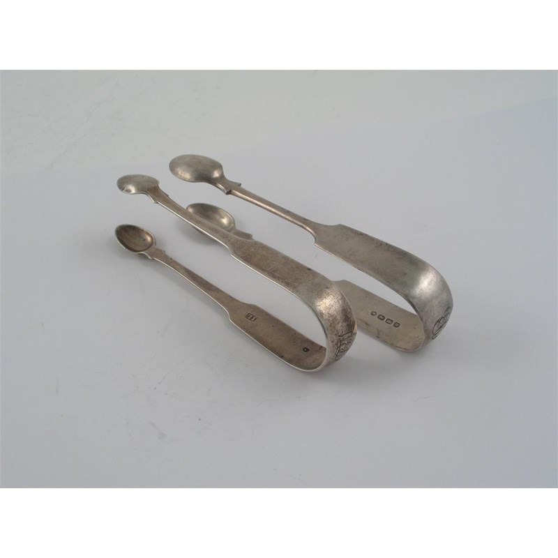 Two pairs of fiddle tongs: Exeter 1864 and London 1808. (2)