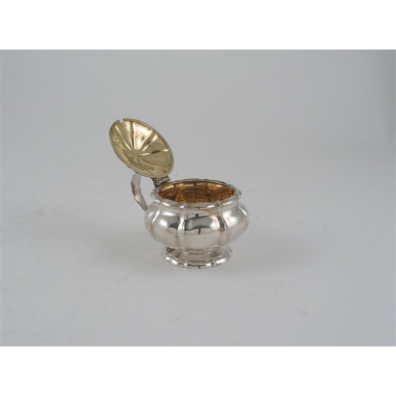 A George IV melon fluted mustard pot, with a ball finial and leafy scroll handle, gilt interior, by William, Charles & Henry Eley, London 1824, 3.5in (9cm) diameter, 5oz.