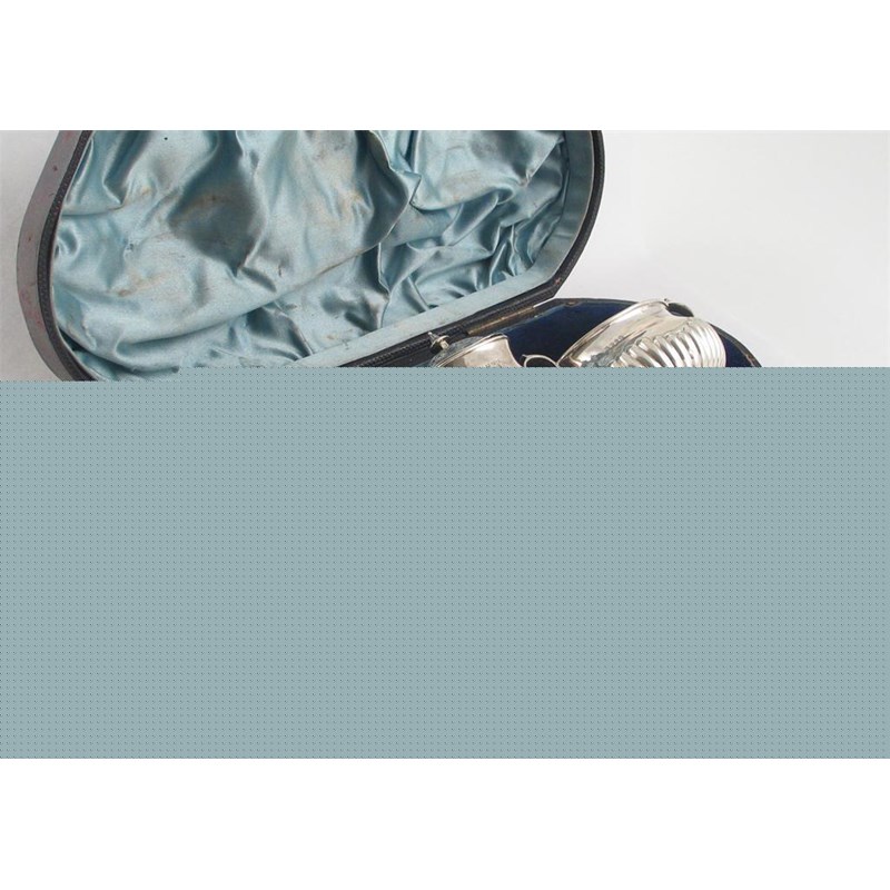 A Victorian cased pair of small two handled salts and a pepperette