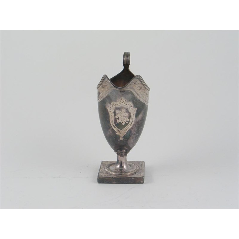 A George III helmet cream jug, on a square pedestal foot with bright-cutting and a shield cartouche, initialled "C", by Peter & Ann Bateman, London 1793, 5.5in (14cm) high, 4oz.