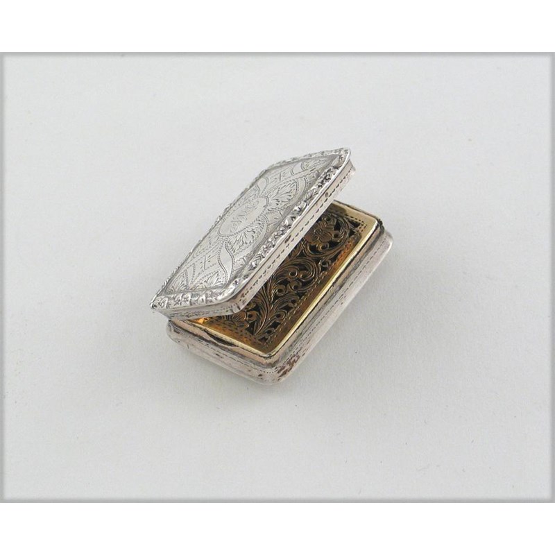 A William IV oblong vinaigrette, with concaved sides a raised floral border and ribbon-like engraving on the cover, initialled, the grille with a floral spray, by Nathaniel Mills, Birmingham 1836, 1.55in (4cm).
