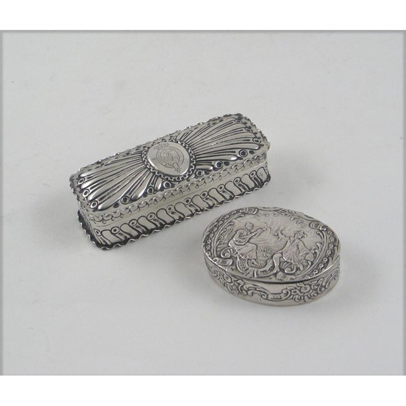 A decorative oval box, with Import marks for 1895 and a Victorian dressing table box and cover, 4oz. (2)