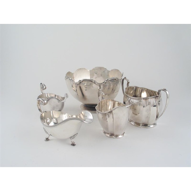 A mixed lot; A small octagonal rosebowl, by Elkington & Co, Sheffield 1909; a modern cream jug and sugar bowl, by T. Bradbury & Sons, London 1910; and a pair of plated sauceboats, 23oz weighable silver. (5)