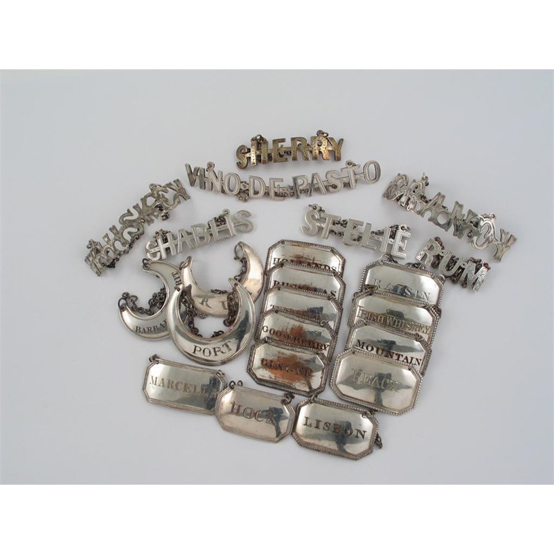 Twenty two plated wine labels (including an Old Sheffiled "Barbadoes Spirit", a "RUM" and "PORT" crescent, seven cut-out names and twelve oblongs). (22)