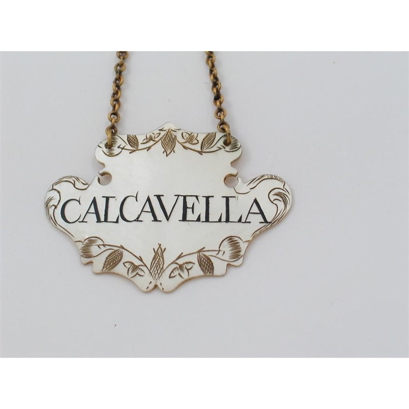 A George III mother of pearl escutcheon wine label, with border engraving, incised and filled "CALCAVELLA".