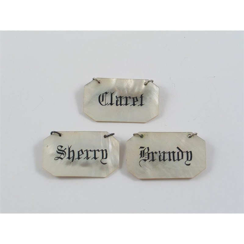 A set of three 19th century canted, mother of pearl wine labels, incised and infilled CLARET, SHERRY & BRANDY. (3)