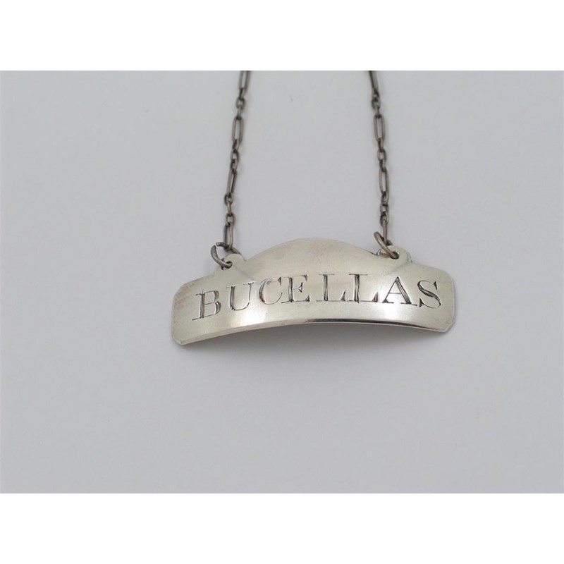 A George III Irish wine label, with a domed top section incised "BUCELLAS", maker's mark "I.E" possibly by James Ebbs, Dublin 1812, retailer's mark of "LAW".