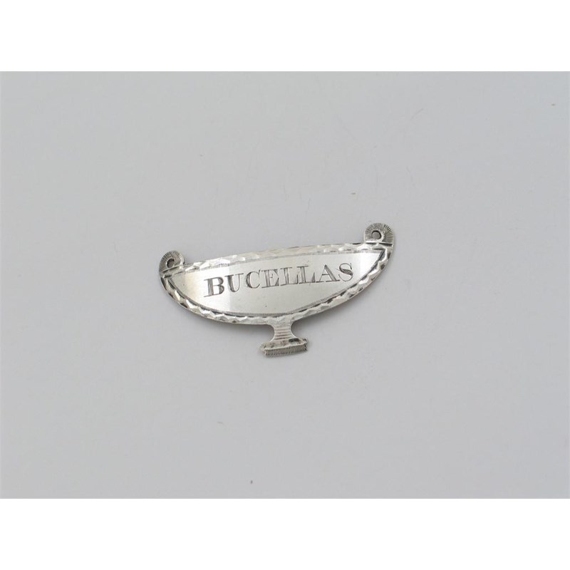 A George IV bright-cut wine label, in the form of a shallow urn, incised "BUCELLAS", by Joseph Wilmore, Birmingham 1826.