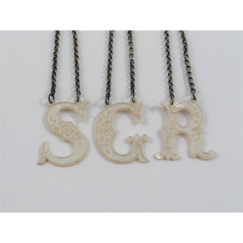 A set of three Victorian mother of pearl, cut-out letter wine labels "S" "G" & "R" with engraving. (3)