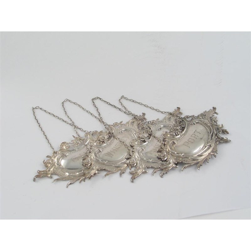 A set of four decorative continental wine labels, "GIN", "WHISKEY", "SHERRY", & "PORT", with Import marks for London 1896. (4)