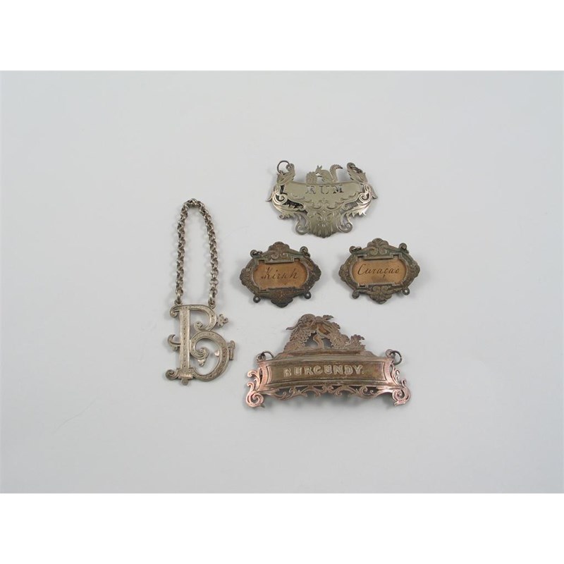Five plated wine labels: a pair with slot-in titles, a cut out "B" and two others with surmounts. (5)