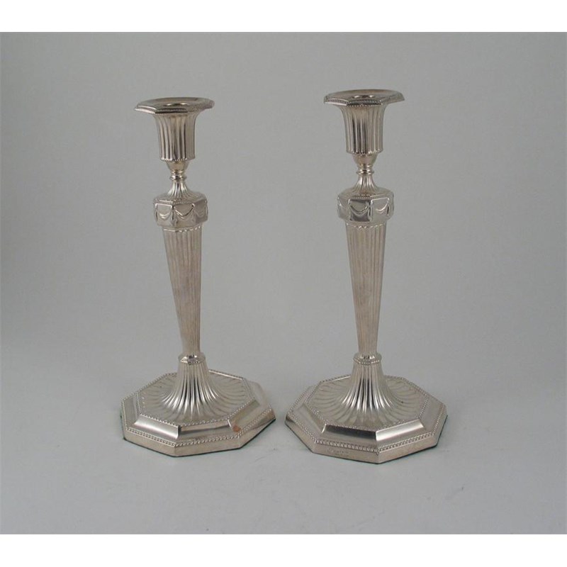 A pair of Edwardian candlesticks, with fluted columns and capitals and octagonal bases with bead borders, detachable nozzles, by Charles Boyton & Sons, London 1907 (loaded), 11in (28cm) high. (2)
