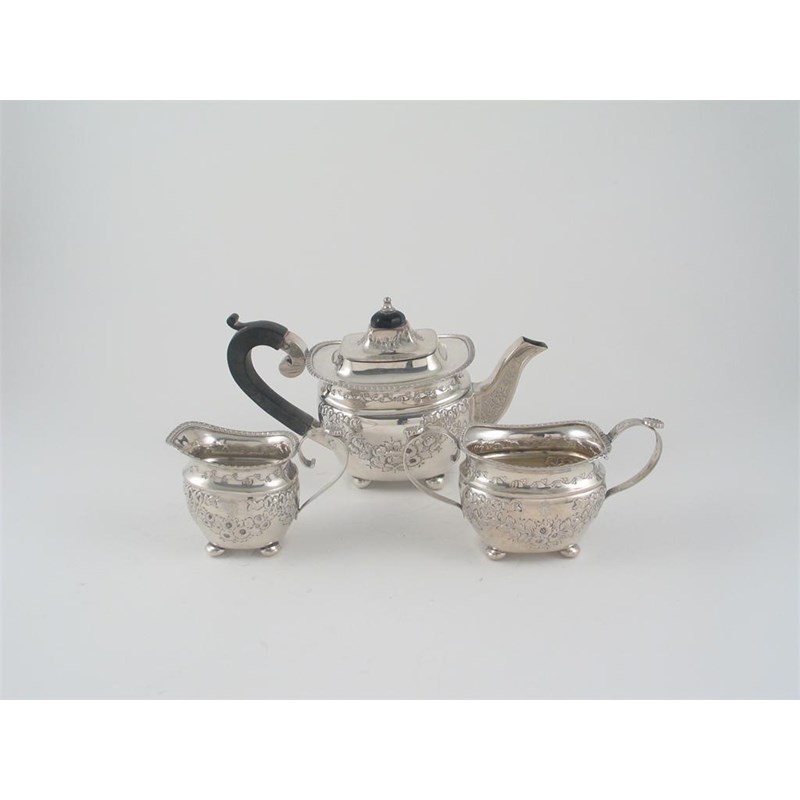 A late Victorian three piece Bachelor's teaset, with embossing and button feet, monogrammed, by J.M. Banks, Birmingham 1892/93, 16oz. (3)