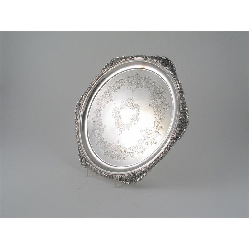 A modern salver, with a shell and gadrooned border and engraved centre, by S. Dawson Ltd, Sheffield 1911, 11in (28cm) diameter, 18oz.