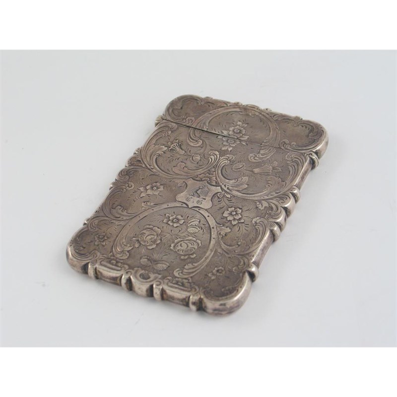 A Victorian florally engraved card case, engraved with a crest and initials, by Edward Smith, Birmingham 1854, 4in (10cm) high, 2oz.